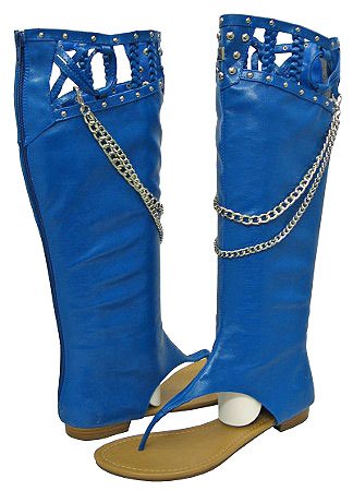 Buy Breckelles Valerie-02 Blue Women Sandal. A one of a kind look for the fashionably bold! Overlapping strappy flats with a thong design. Mid-calf sleeve; stud accents with a wrapped around metal chain. Tall 15.5'' Shaft 15.5"